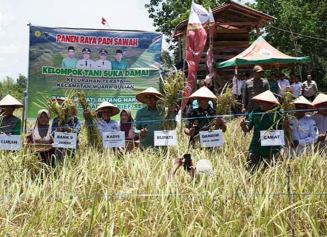 EXPOSSE.COMI BATANGHARI – Bupati Batang Hari Muhammad Fadhil Arief menghadiri Panen Raya Padi Sawah Kelompok Tani Suka Damai di Kelurahan Teratai Kecamatan Muara Bulian, Rabu (18/9/2024)