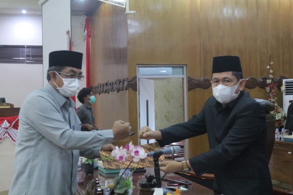 EXPOSSE.COMI TANJABBAR – Bupati H. Anwar Sadat menghadiri rapat paripurna DPRD Kabupaten Tanjung Jabung Barat dalam rangka penandatangan Nota kesepakatan rancangan awal RPJMD Kabupaten Tanjung Jabung Barat 2021 – 2026 di ruang rapat paripurna DPRD, Senin (14 /6) .