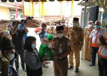 EXPOSSE.COMI JAMBI - Wali Kota Jambi, H Syarif Fasha dan Wakil Wali Kota Jambi, H Maulana menyerahkan Bantuan Sembako bagi...